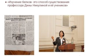 Доклад Гульсании Нуртыновны «Счастье поиска в науке» был посвящён научному пути доктора медицинских наук, профессора, заведующего кафедрой биологической химии и клинической лабораторной диагностики Астраханского ГМУ Дине Максимовне Никулиной. Ученица Ю.С.Татаринова, Дина Максимовна не только сохранила научное направление по иммунохимии злокачественных тканей, но и сформировала новые. Профессор Никулина является ярким примером женщины- исследователя, которая твёрдо убеждена, что человек может совершить больше, чем ему кажется. Она уверена, что в современном мире жизнеспособна только активная позиция, которую Дина Максимовна и демонстрирует на примере успешной работы своей кафедры. Сам же успех профессор Никулина характеризует как обратную сторону тяжёлой работы. Форум, на котором был представлен доклад, проходил в рамках научно-просветительской смены «Зарядись наукой». И на пример6е деятельности таких женщин России, как Дина Максимовна Никулина, и можно зарядиться наукой на всю жизнь, зарядить её других, воплощая в жизнь задуманное, на первый взгляд, кажущееся неосуществимым.