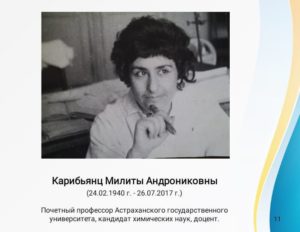 Младшая дочь Андраника Семёновича, Милита Карибьянц (мама Марины Владимировны), стала, как и её мама Карибьянц (Халафова) Тамара Петровна, химиком. Окончив Рыбвтуз, она более 50 лет преподавала на химическом факультете АГУ. По педагогическому пути пошла также Вера Петровна Халафова — сестра Тамары Петровны. Она преподавала русский язык и литературу. Окончить аспирантуру ей помешала Великая Отечественная война. Филологом стала и дочь Милиты Андрониковны Елена, которая преподает английский язык.По стопам своих родных пошла дочь Марины Владимировны — Софья, которая учится и преподает на биологическом факультете АГУ.