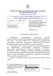 Департамент государственной молодежной политики и воспитательной деятельности Министерства науки и высшего образования России выразил благодарность членам студенческого туристского клуба «Доктур» Астраханского ГМУ за активную деятельность в 2025 г., поддержку студенческих инициатив, направленных на патриотическое воспитание молодежи посредством вовлечения в активный туризм, а также включенность в мероприятия, проводимые Минобрнауки России в данном направлении в 2025 г.