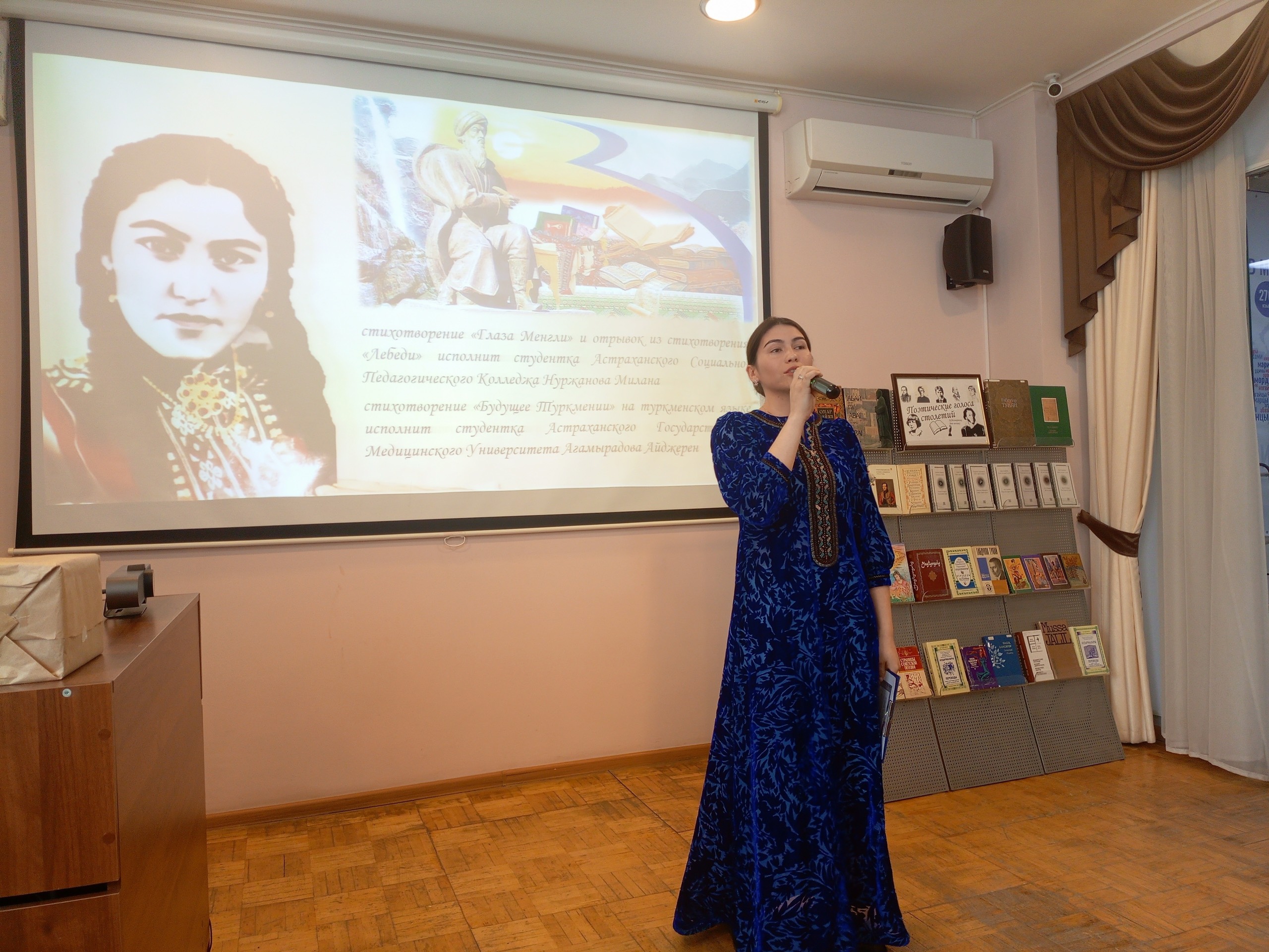 В рамках Всемирного Дня поэзии иностранные студенты Астраханского ГМУ стали участниками литературной гостиной «Вечная и прекрасная музыка слов», организованной совместно с Областной научной библиотекой имени Н.К. Крупской в рамках проекта «Центр дружественных литератур стран Прикаспийского региона». Преподаватели кафедры русского языка подготовили обучающихся Астраханского ГМУ к декламации поэтических произведений на фарси, туркменском и русском языках: студентка 2 курса ФИС (специальность «Стоматология») Марьям Багири (Иран) выступила со стихотворением Хафиза Ширази «Как я страдал, как я любил…». Студентки 2 курса лечебного факультета Агамырадова Айджерен (Туркменистан) и Танырберганова Фарангиз (Туркменистан) прочитали стихотворения Махтумкули Фраги «Будущее Туркмении» и «Ширгази».