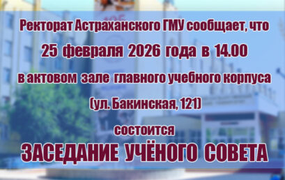 Повестка заседания Ученого Совета ФГБОУ ВО Астраханский ГМУ Минздрава России 25.02.2026 1. УТВЕРЖДЕНИЕ КАНДИДАТОВ, ПОДАВШИХ ЗАЯВЛЕНИЯ ДЛЯ УЧАСТИЯ В ВЫБОРАХ НА ДОЛЖНОСТЬ РЕКТОРА АСТРАХАНСКОГО ГМУ. Докладчик: председатель комиссии по […]