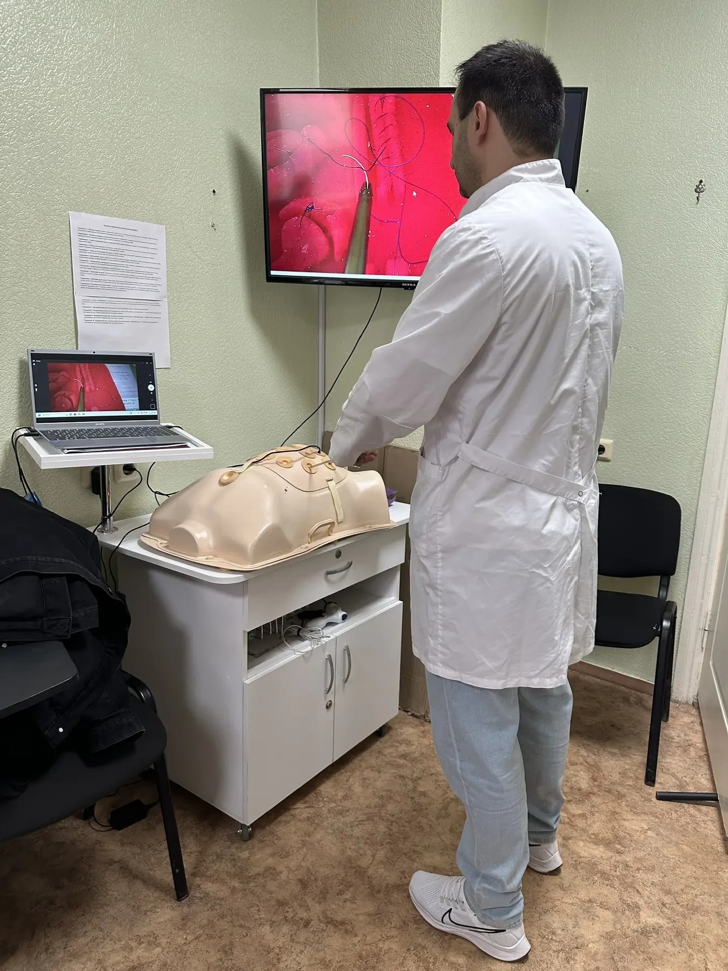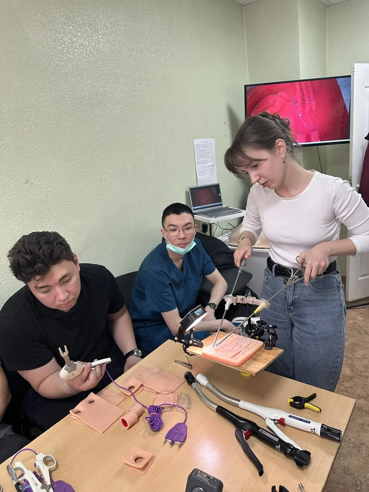 • на симуляторах отработали навыки эндоскопических операций абдоминальной хирургии.