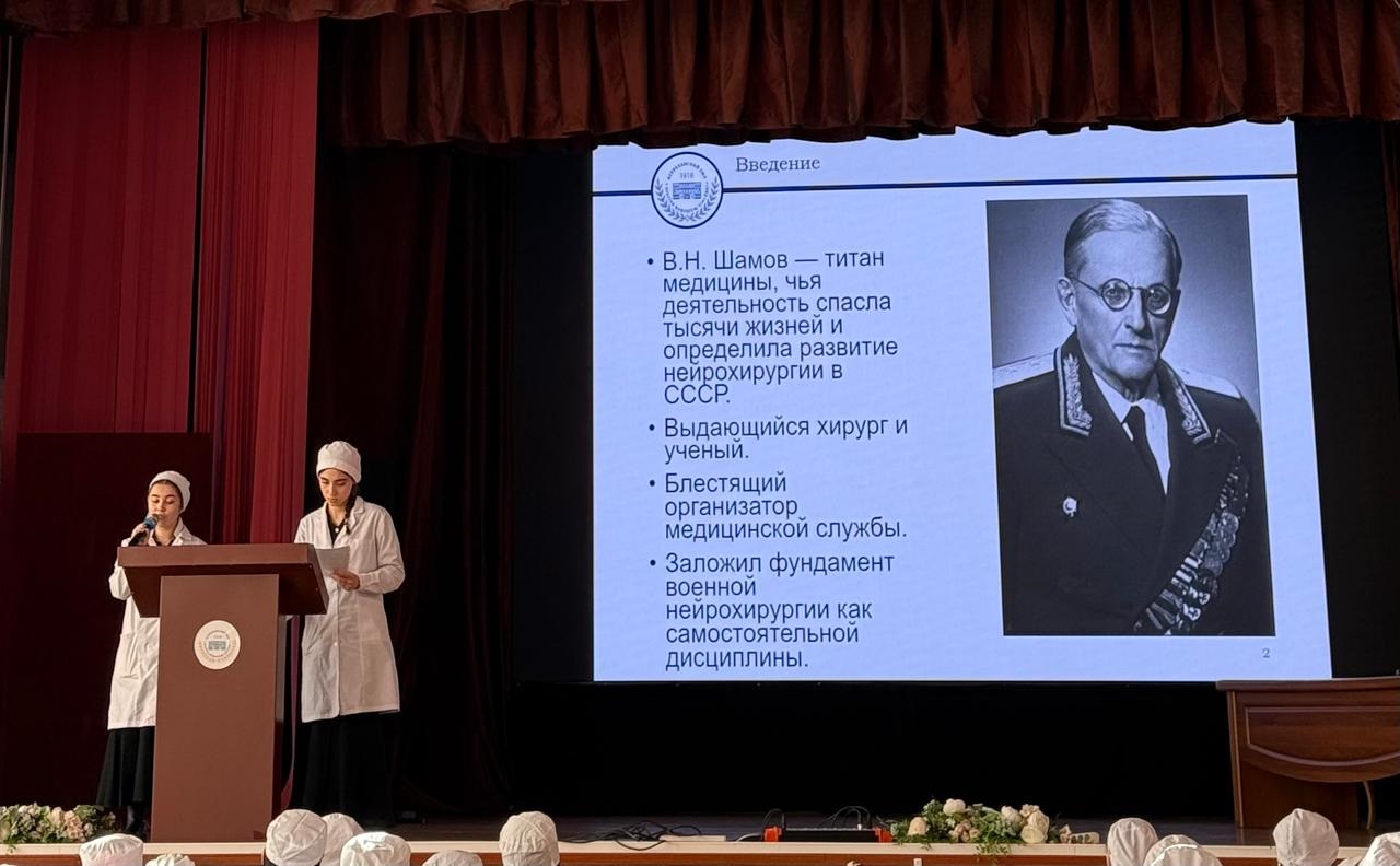 – Вагабова Асият и Сефибекова Амина (118 леч.фак.) с докладом «Шамов Владимир Николаевич – создатель научной школы военной нейрохирургии» – научный руководитель: старший преподаватель Кострыкина Л.С.;