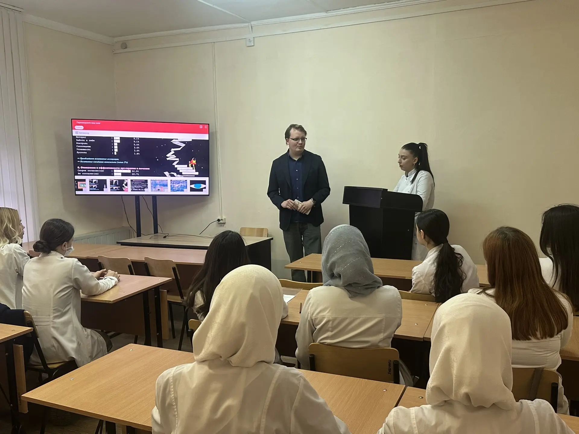 27 февраля состоялось заседание МНО кафедры профилактической медицины и здорового образа жизни на тему: «Искусство как источник саморегуляции». С большим интересом были заслушаны результаты исследовательских работ студенток 309 группы лечебного факультета Камалудиновой Б.М., и Батрахановой Д.Б на тему «Психологическая саморегуляция: творческие и когнитивные подходы» и студентки 310 группы лечебного факультета Загуевой Р.А «Перезагрузите ваш мозг: нейробиология арт-терапии», подготовленные под научным руководством к.м.н., ассистента кафедры профилактической медицины и ЗОЖ Наумова А.В. На основании составленных анкет ими были опрошены студенты АГМУ, что позволило рассмотреть механизмы психологической саморегуляции и возможности использования творческих практик в профилактике эмоционального выгорания и стресса, а также нейрофизиологические механизмы воздействия арт-терапии на когнитивные процессы и эмоциональное состояние человека. Студентка 307 группы лечебного факультета Киселёва М.С представила работу на тему «Влияние современной и классической музыки на психическое и физическое здоровье человека», выполненную под научным руководством ассистента кафедры профилактической медицины и ЗОЖ Арутюнян А.А. В ее докладе были освещены данные о влиянии различных видов музыки на уровень стресса, психоэмоциональное состояние и соматическое здоровье человека. По завершении мероприятия участникам были вручены разработанные председателем МНО студенткой 410 группы лечебного факультета Соловьевой А.А., информационные буклеты, посвященные вопросам здорового образа жизни.