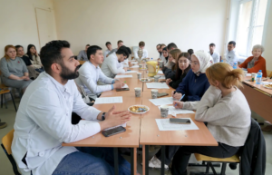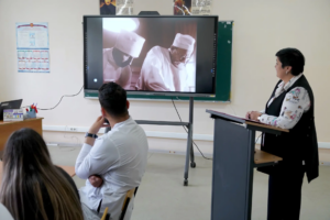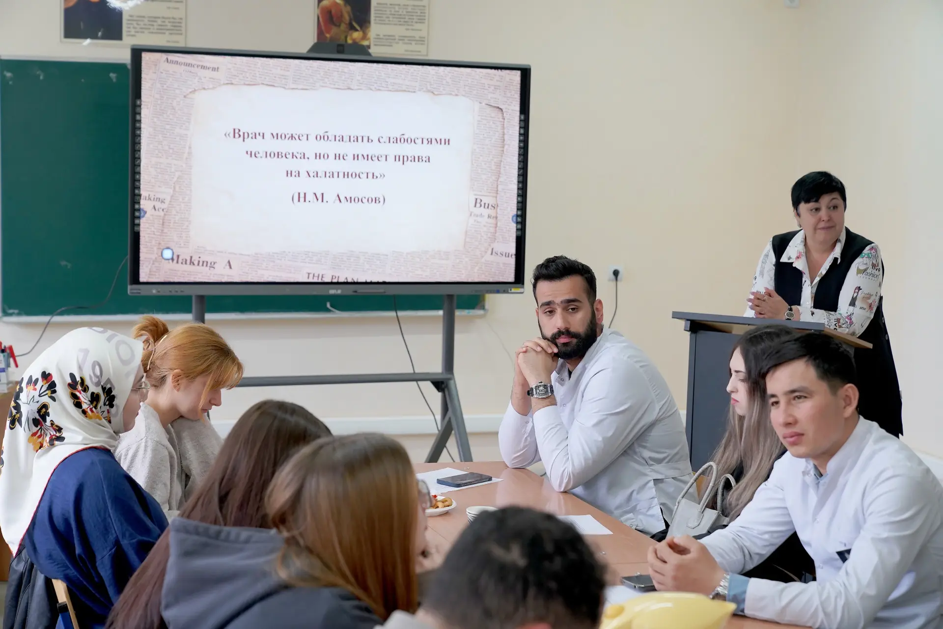 Одним из ярких мероприятий Недели стала организованная 23 апреля литературно-музыкальная гостиная «Врачебный долг и совесть: по следам доктора Булгакова», приуроченная к 135-летию писателя. Участниками встречи стали иностранные студенты и слушатели подготовительного отделения, российские студенты 1-2 курсов факультета клинической психологи, а также ординаторы. Программа мероприятия включала знакомство с биографией Михаила Афанасьева, чей жизненный путь неразрывно связан с медициной; просмотр и обсуждение фрагментов из кинофильмов «Записки юного врача», «Морфий», «Собачье сердце», «Мастер и Маргарита»; а также составление «музыкального рецепта». Через кадры знаменитых экранизаций участники встречи погружались в этические лабиринты профессии: от «страха первого пациента» до вопросов ответственности за научный эксперимент.